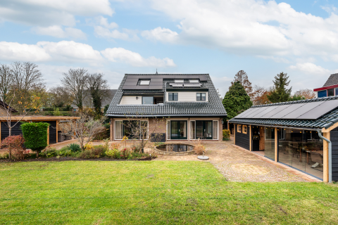 De fraaie zij- en achtertuin ligt op het zuidwesten en is daardoor optimaal op de zon gericht. De tuin is sfeervol aangelegd met een combinatie van vlonders, houtsnippers en gras, omringd door siergrassen, struiken en kleurrijke beplanting. Hier geniet u volop van rust en privacy. Op de eigen oprit is ruimte voor twee auto’s.